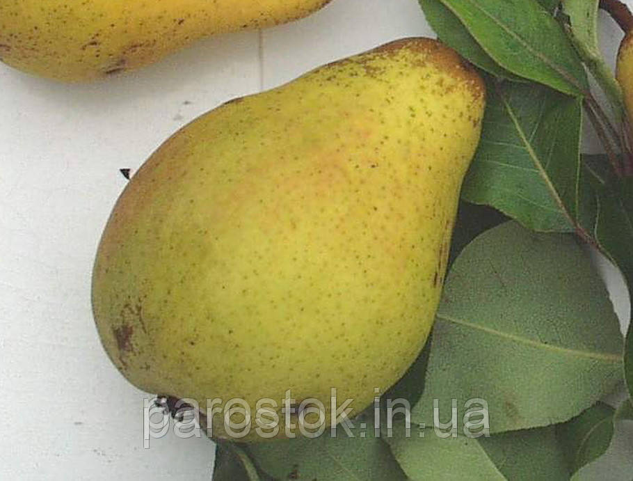 Плоди крупні. Видовжено-грушоподібні (маса 260 — 280 г.), забарвлення може варіювати від сірувато-зеленого до зеленкувато-жовтого, оржавленість виражена, іноді буває легкий рум'янець.